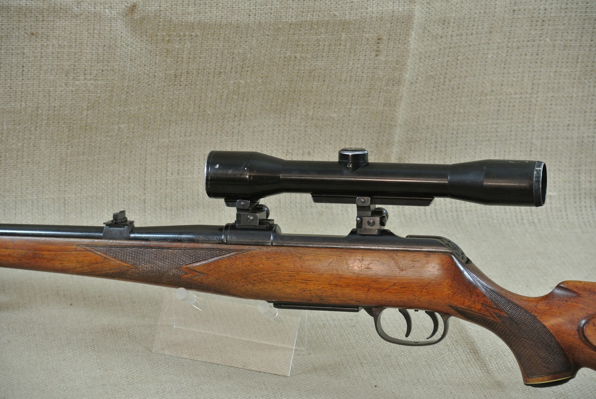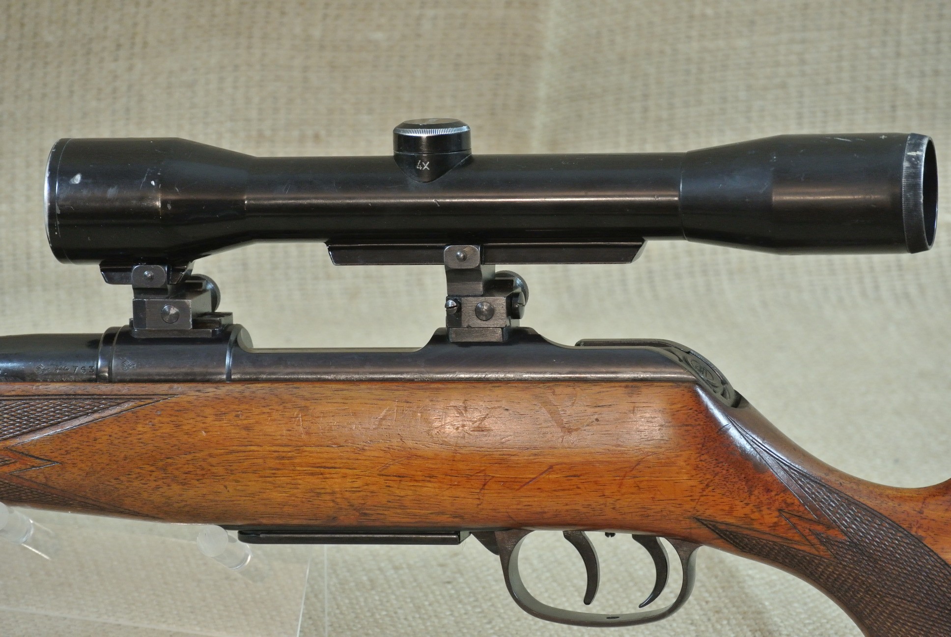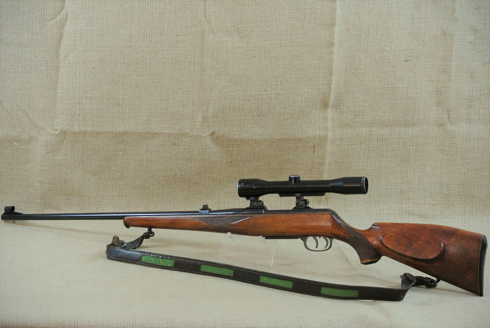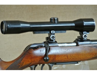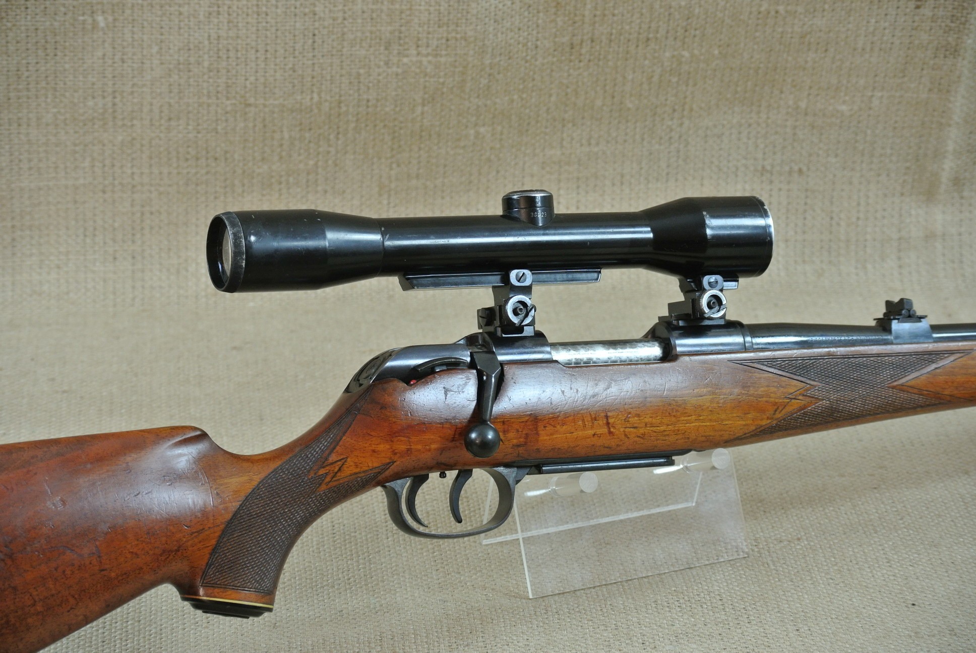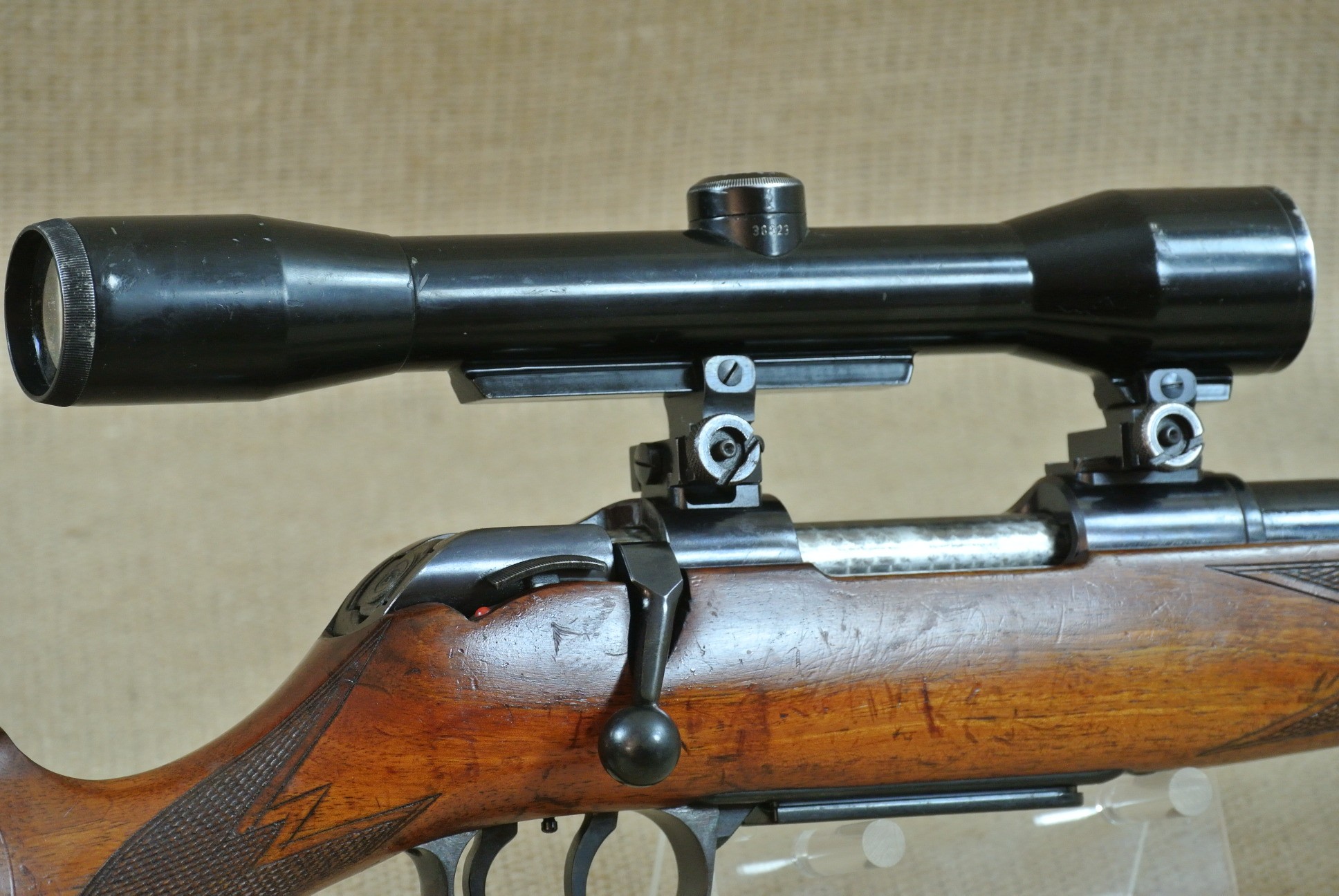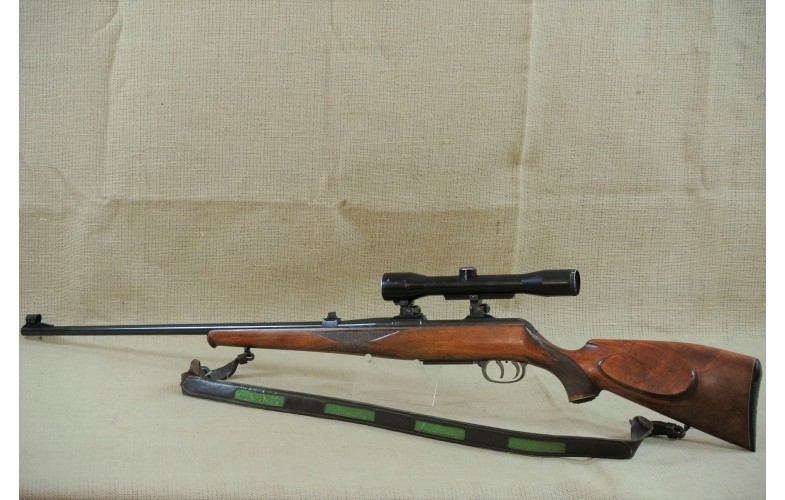 Äußerlich deutliche Gebrauchsspuren, inkl. Zielfernrohr Norris 4 x 36, Absehen 1 mit Klemm-Montage. Lauf sehr gut, blank.