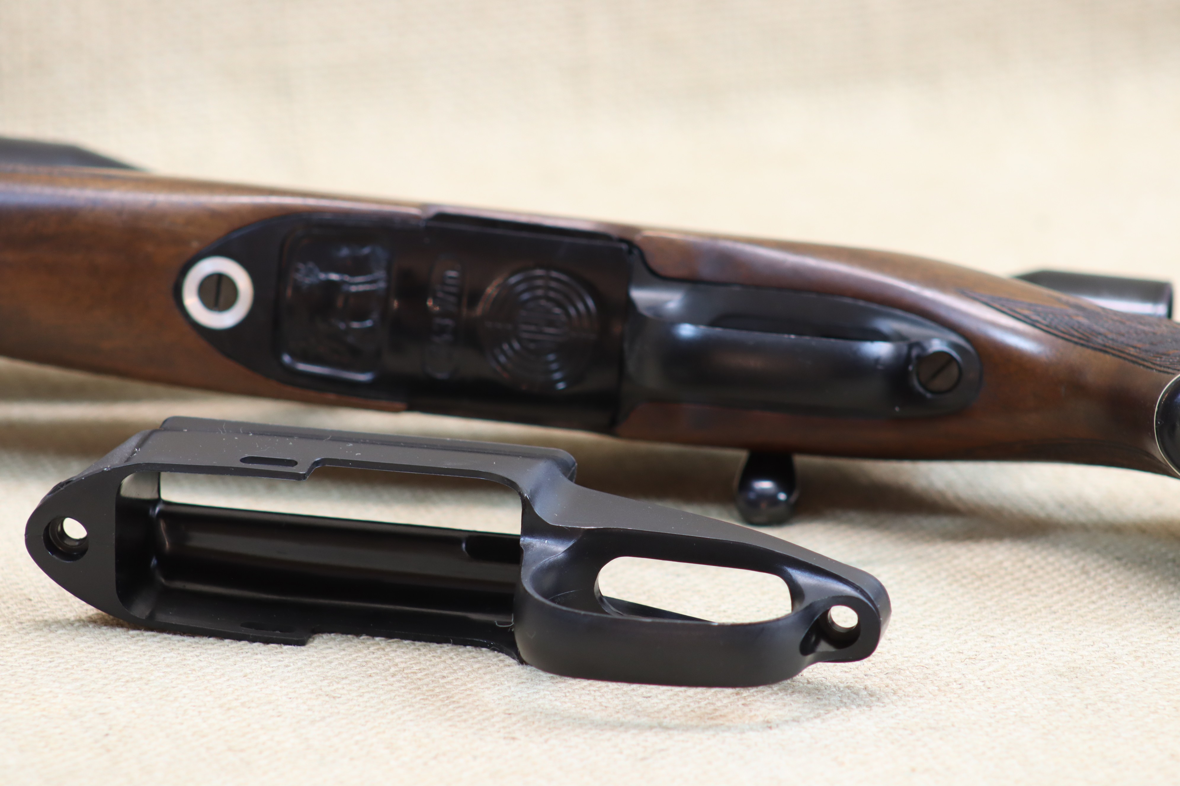 Der Abzugsbügel/Magazinschacht wurde an der vorderen Schraube fachmännisch, mit einer Alu-Hülse repariert.