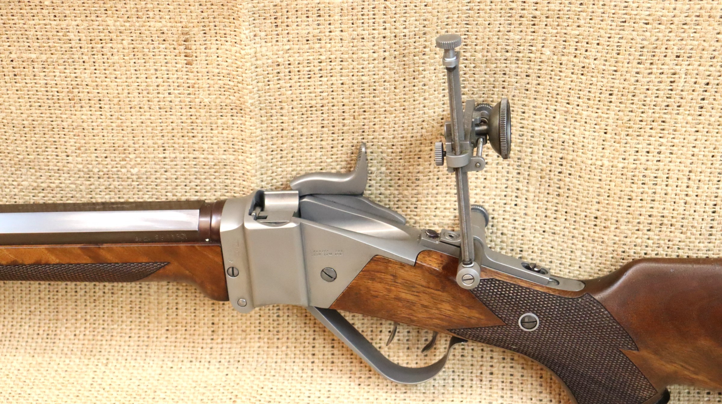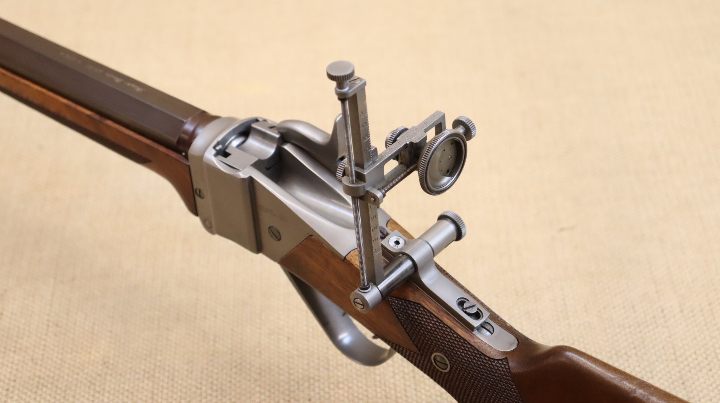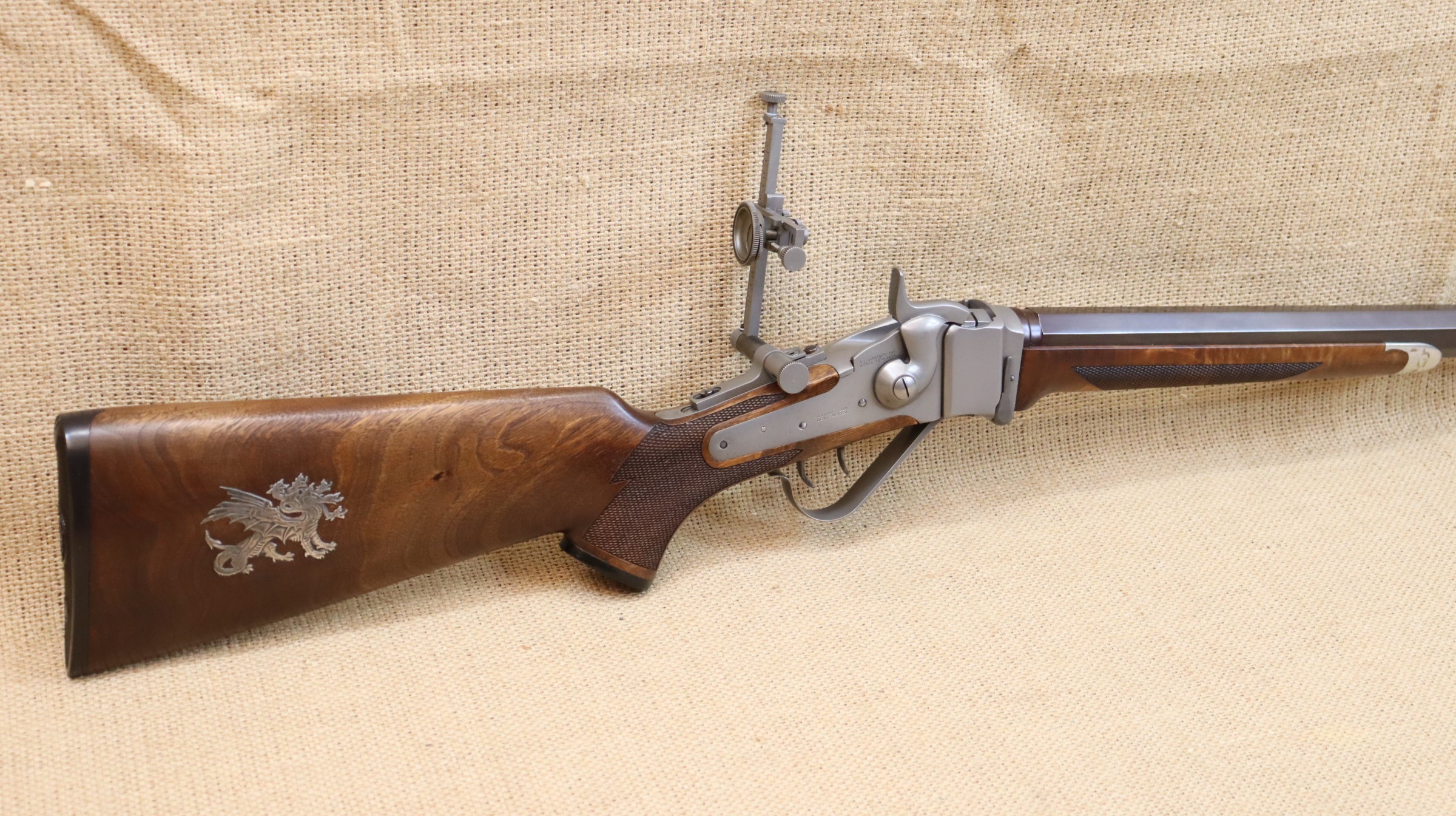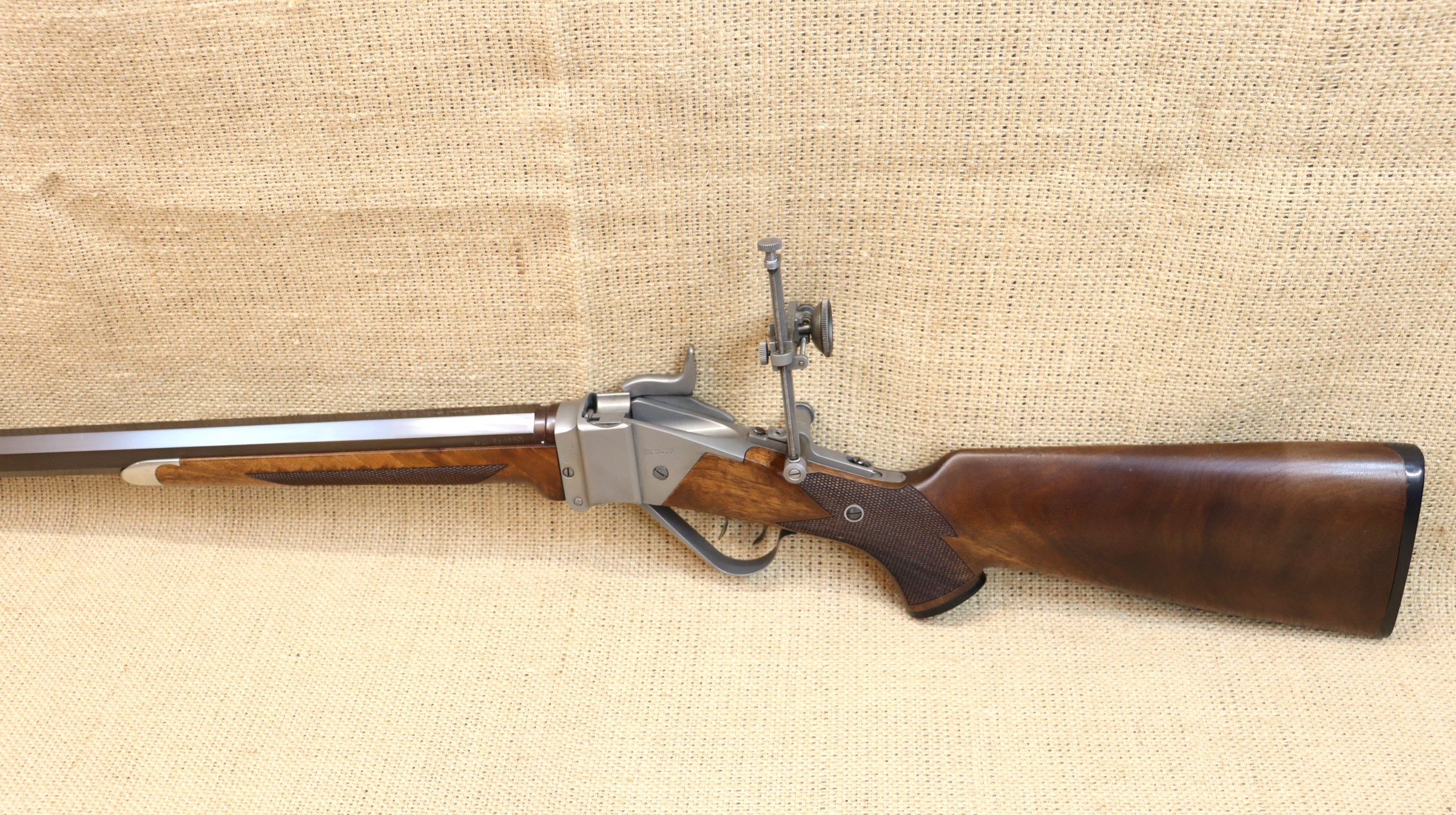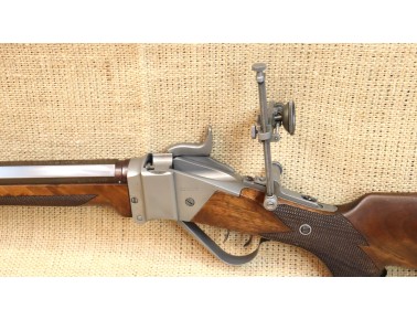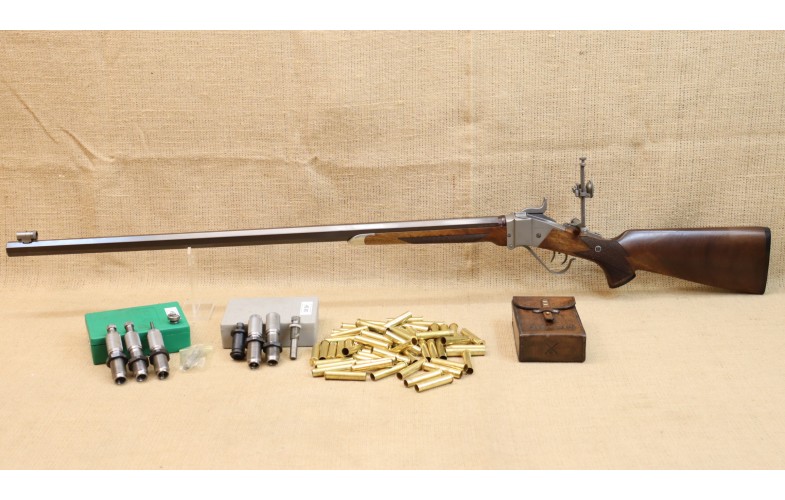 Sehr guter Zustand, bräunierter Lauf. Ein hochwertiger Diopter vom Sharps Doctor, Matrizensatz, Hülsen gehören zum Lieferumfang.