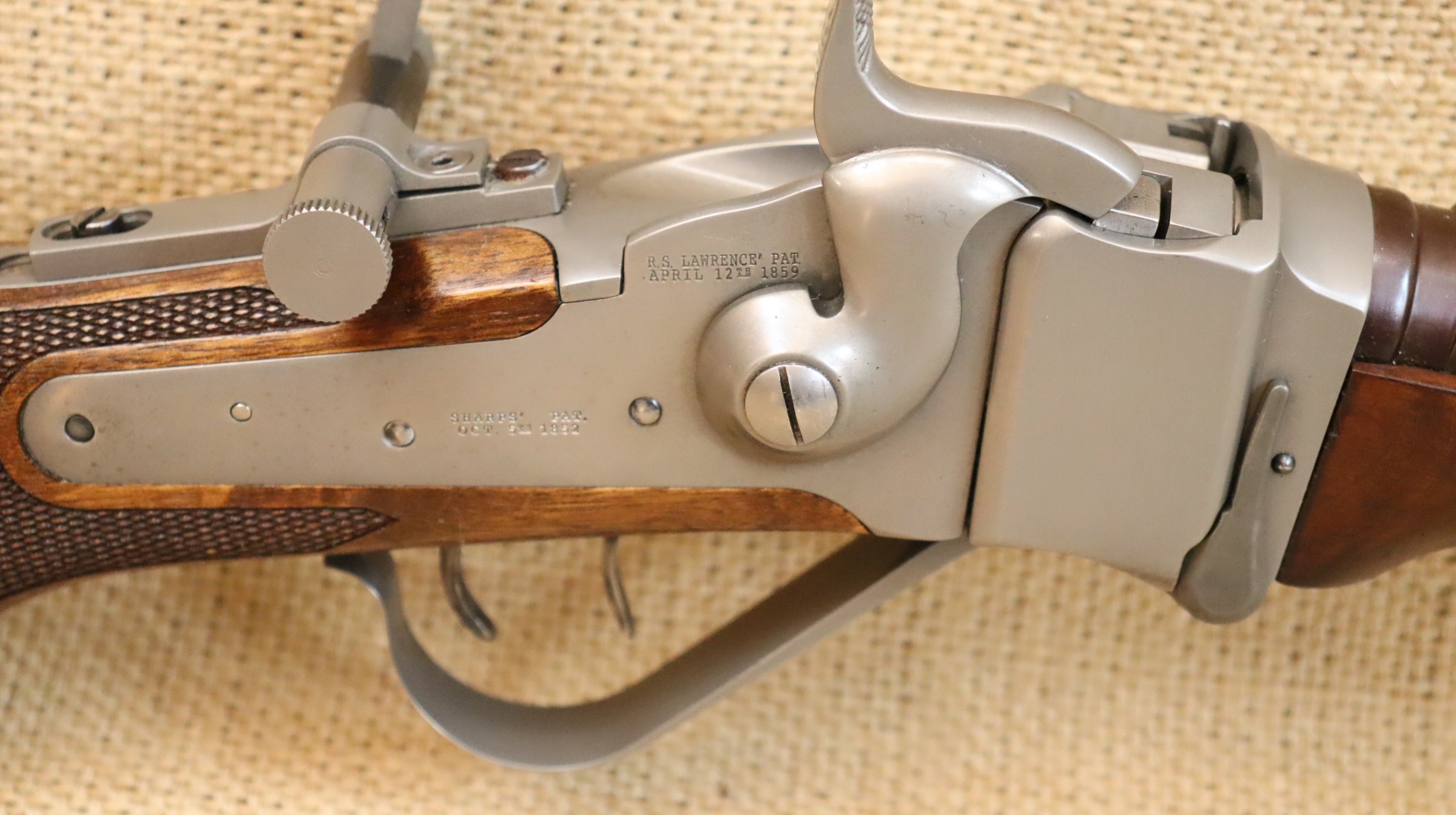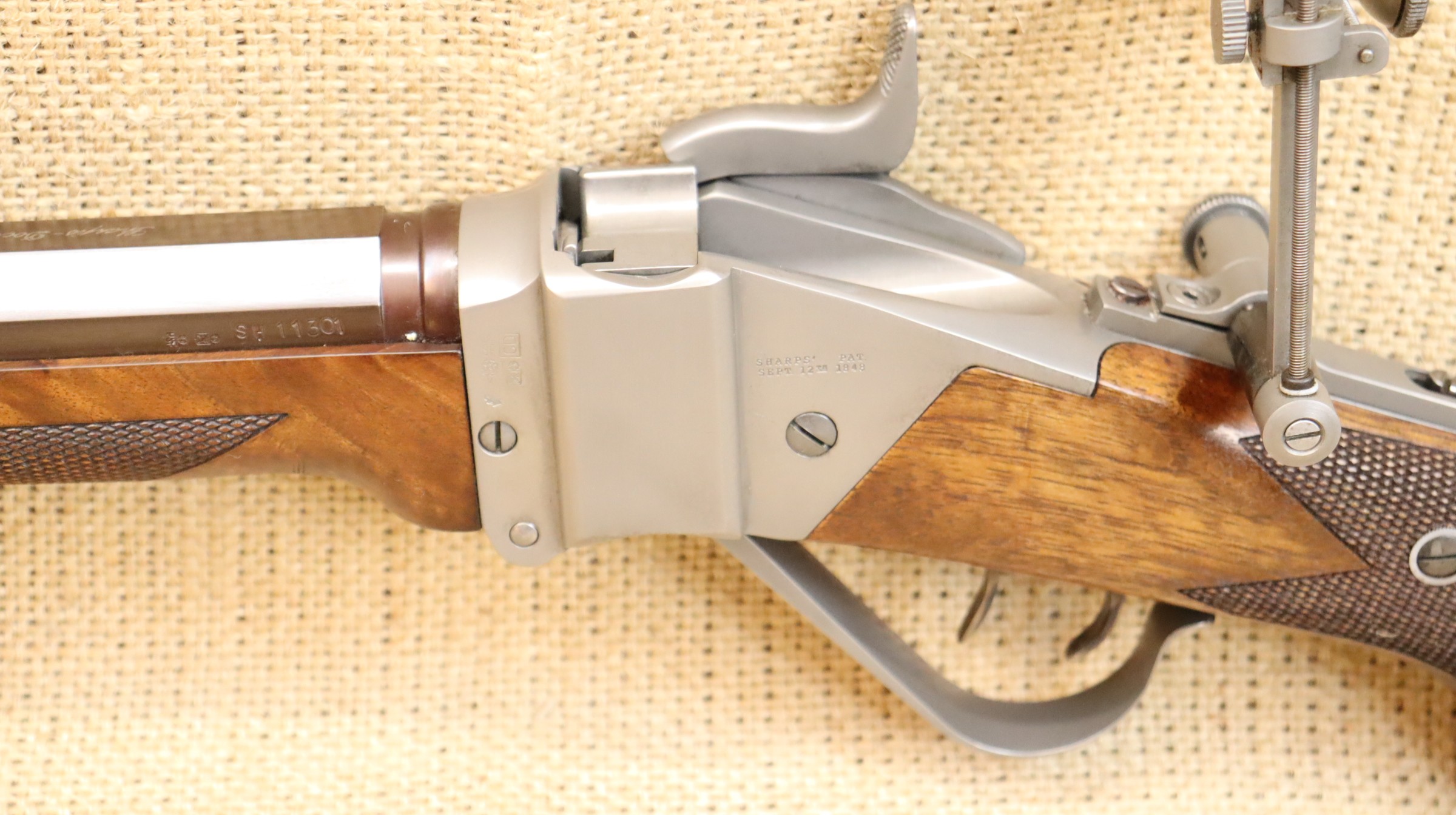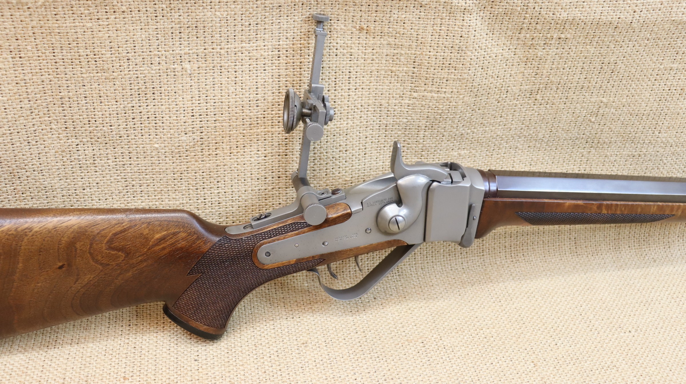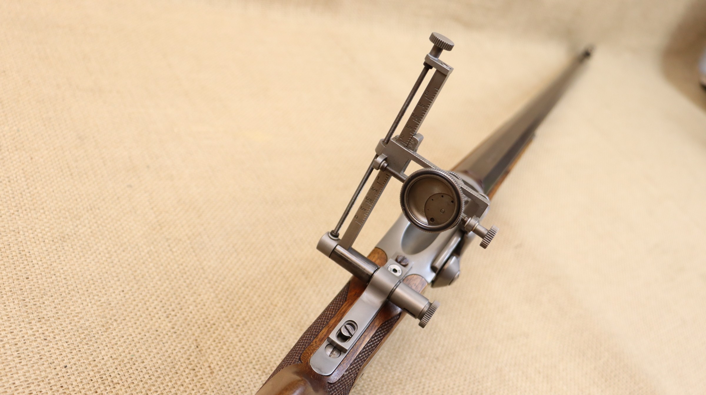 Sehr guter Zustand, bräunierter Lauf. Ein hochwertiger Diopter vom Sharps Doctor, Matrizensatz, Hülsen gehören zum Lieferumfang.