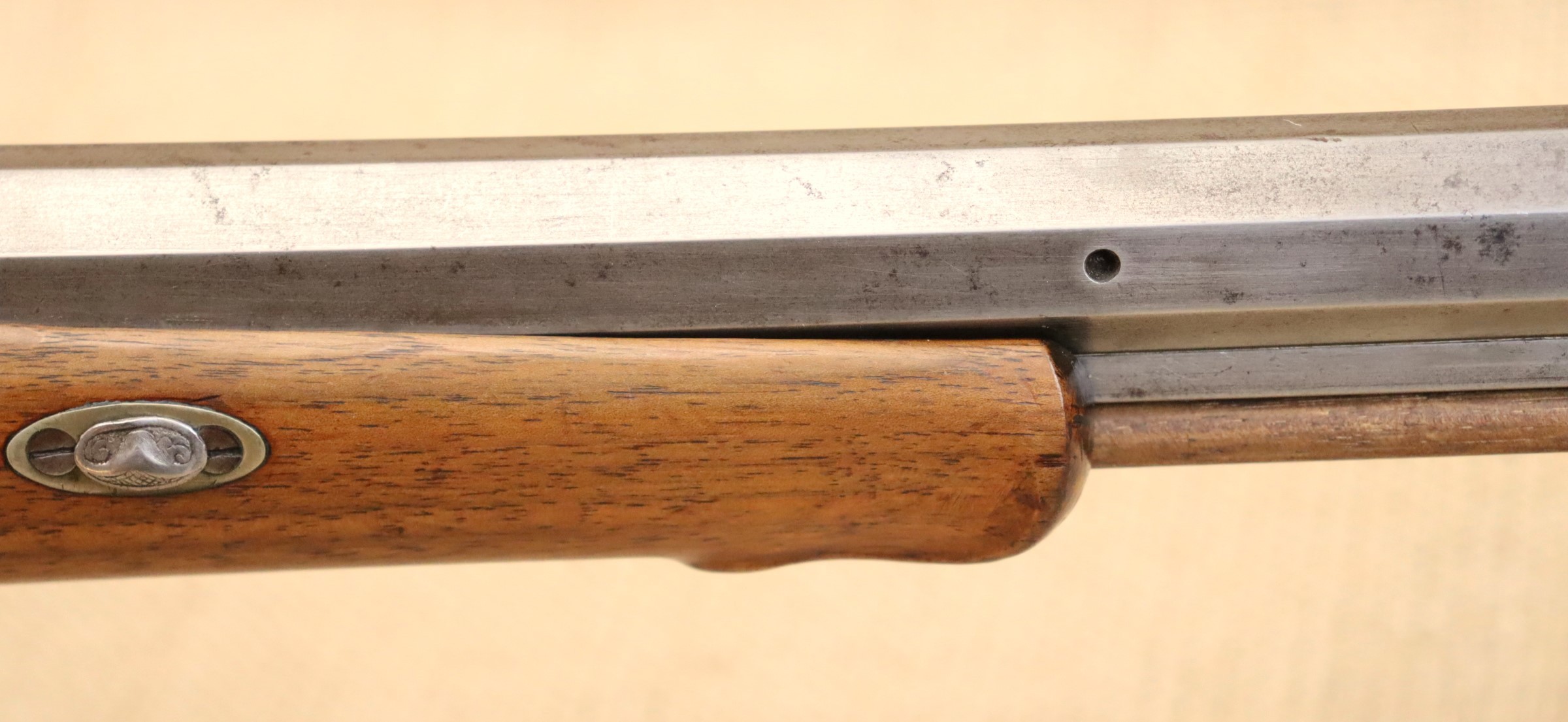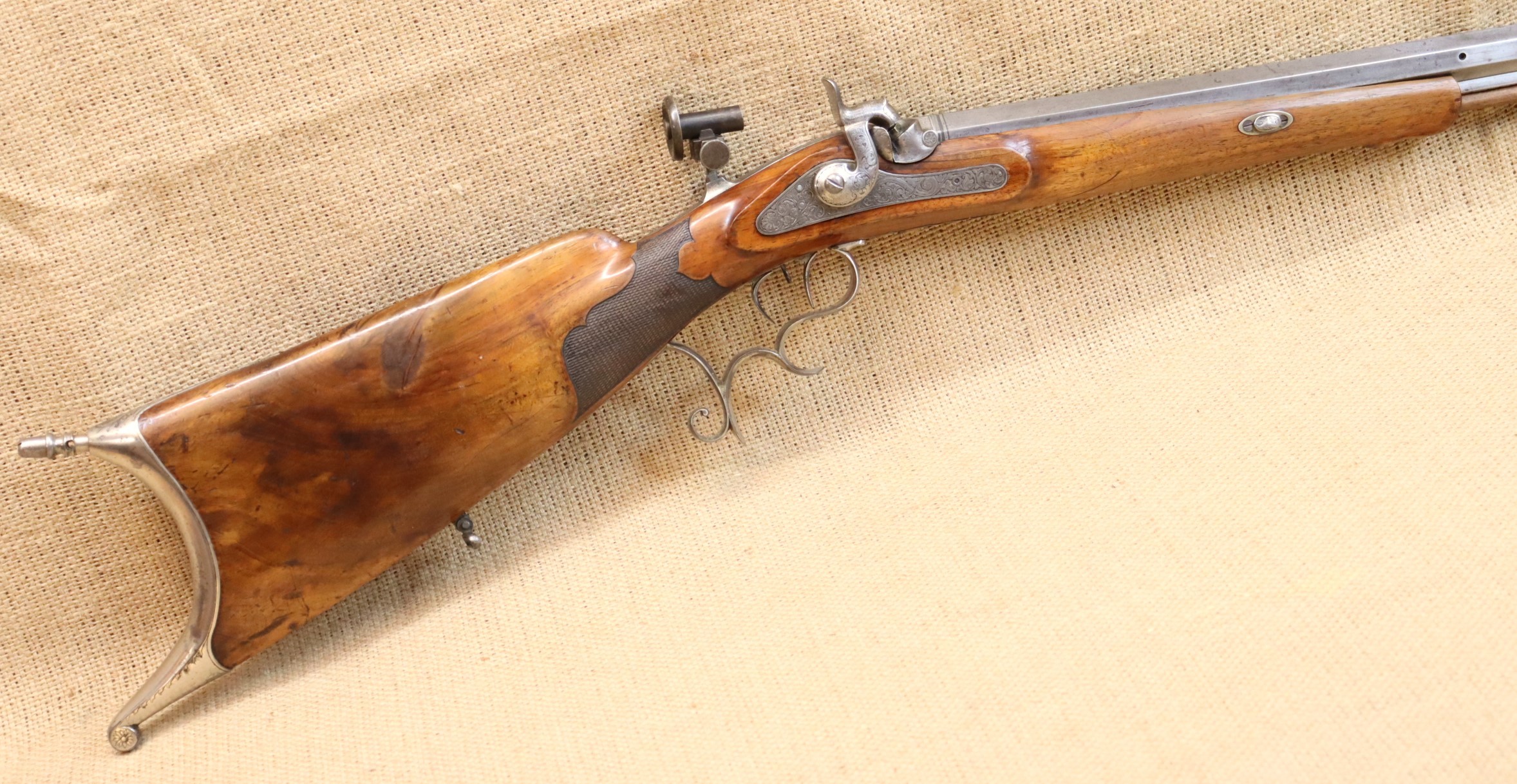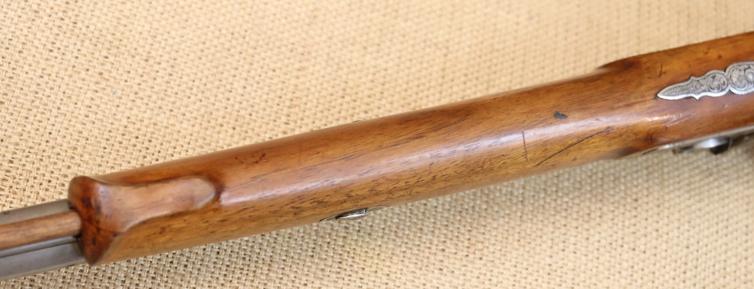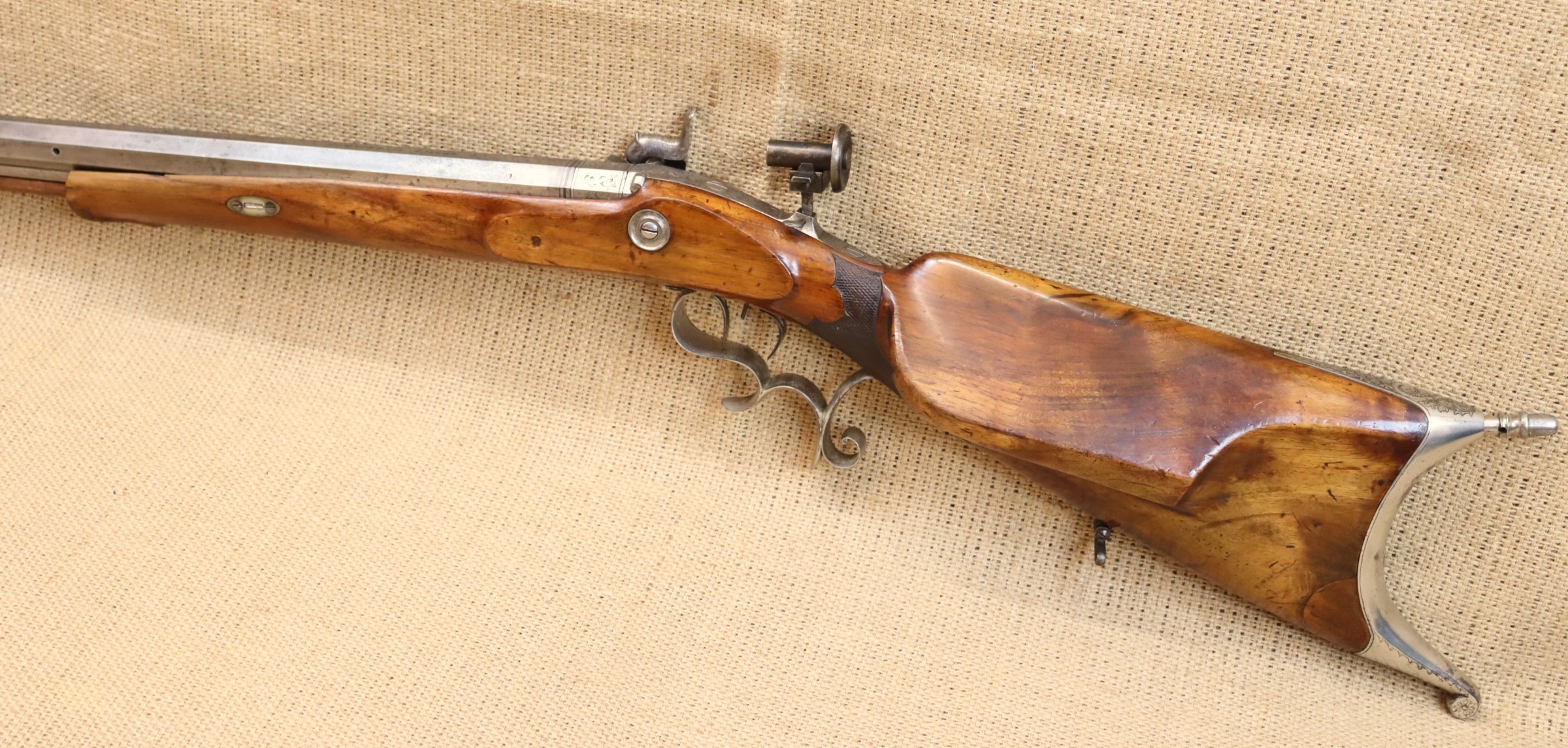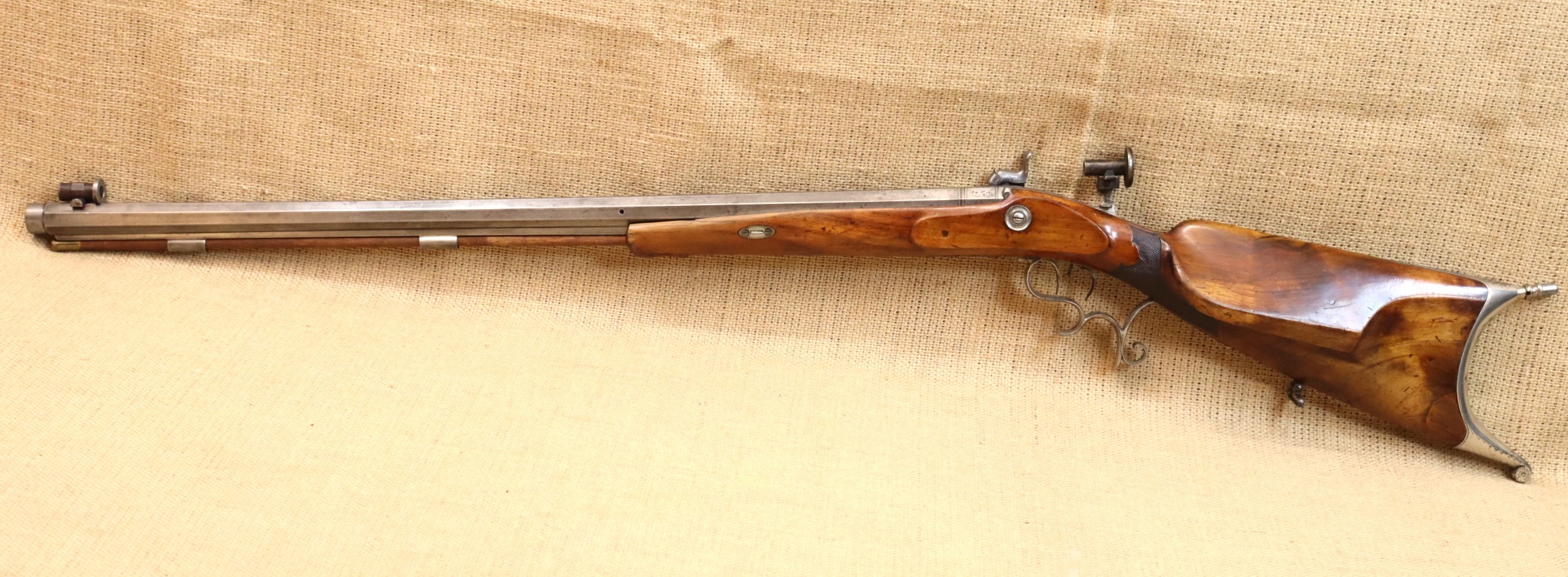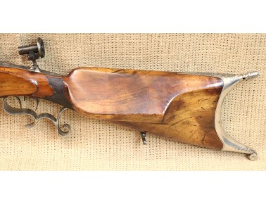 Schöne originale Scheibenbüchse in noch sehr gutem Zustand. Lauf blank mit sehr gutem Zug- / Feldprofil. Kaliber ca. 10,2 mm (an der Mündung gemessen).