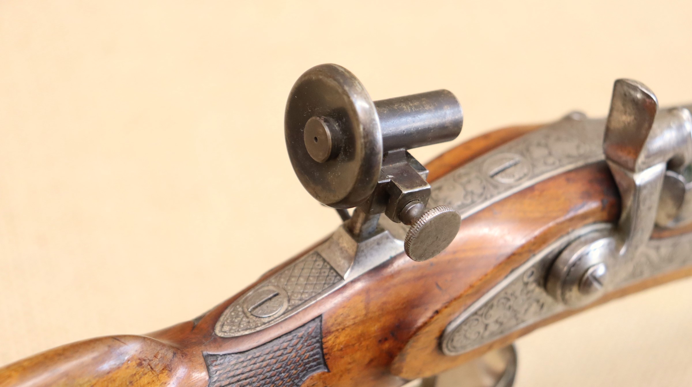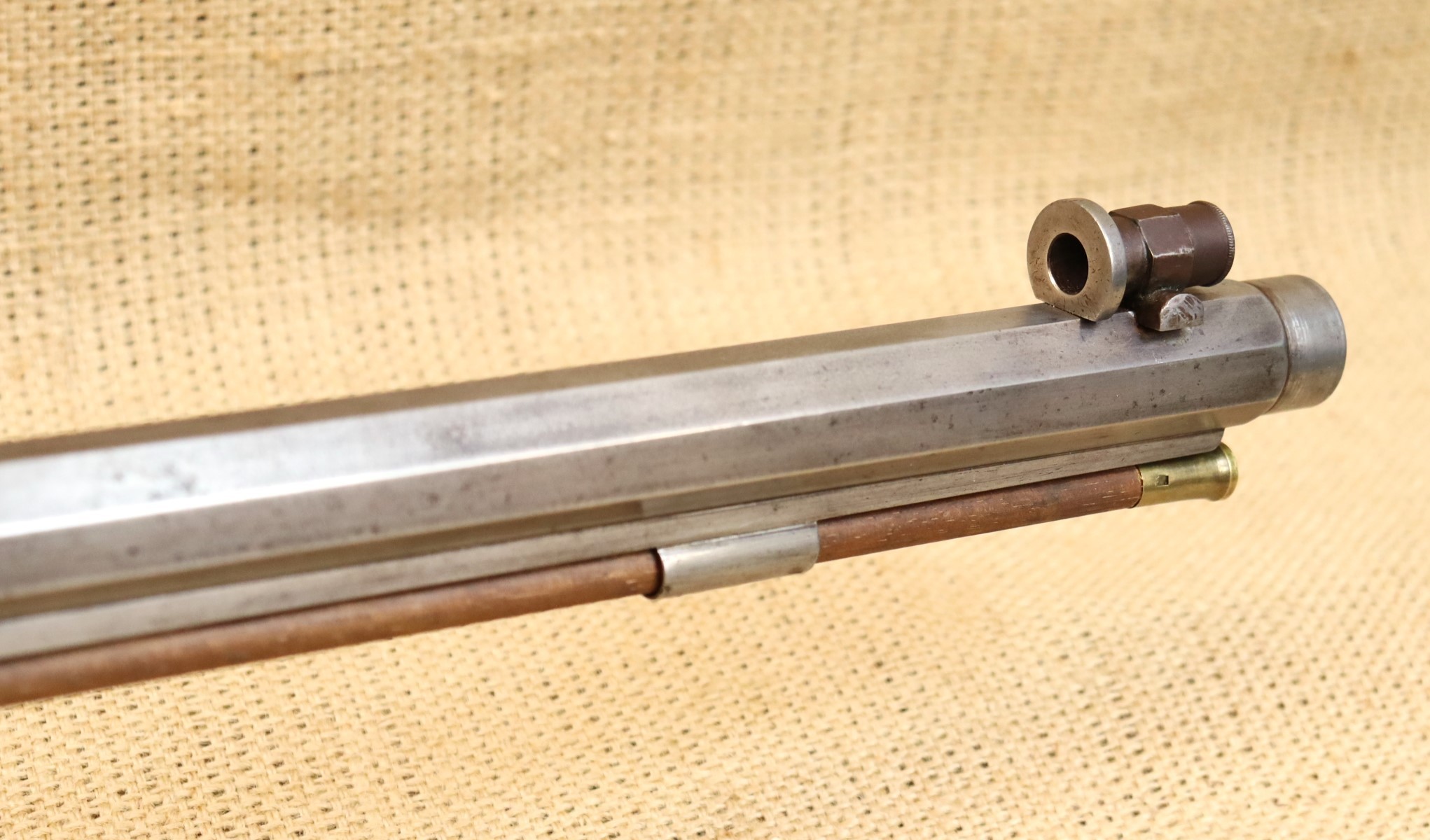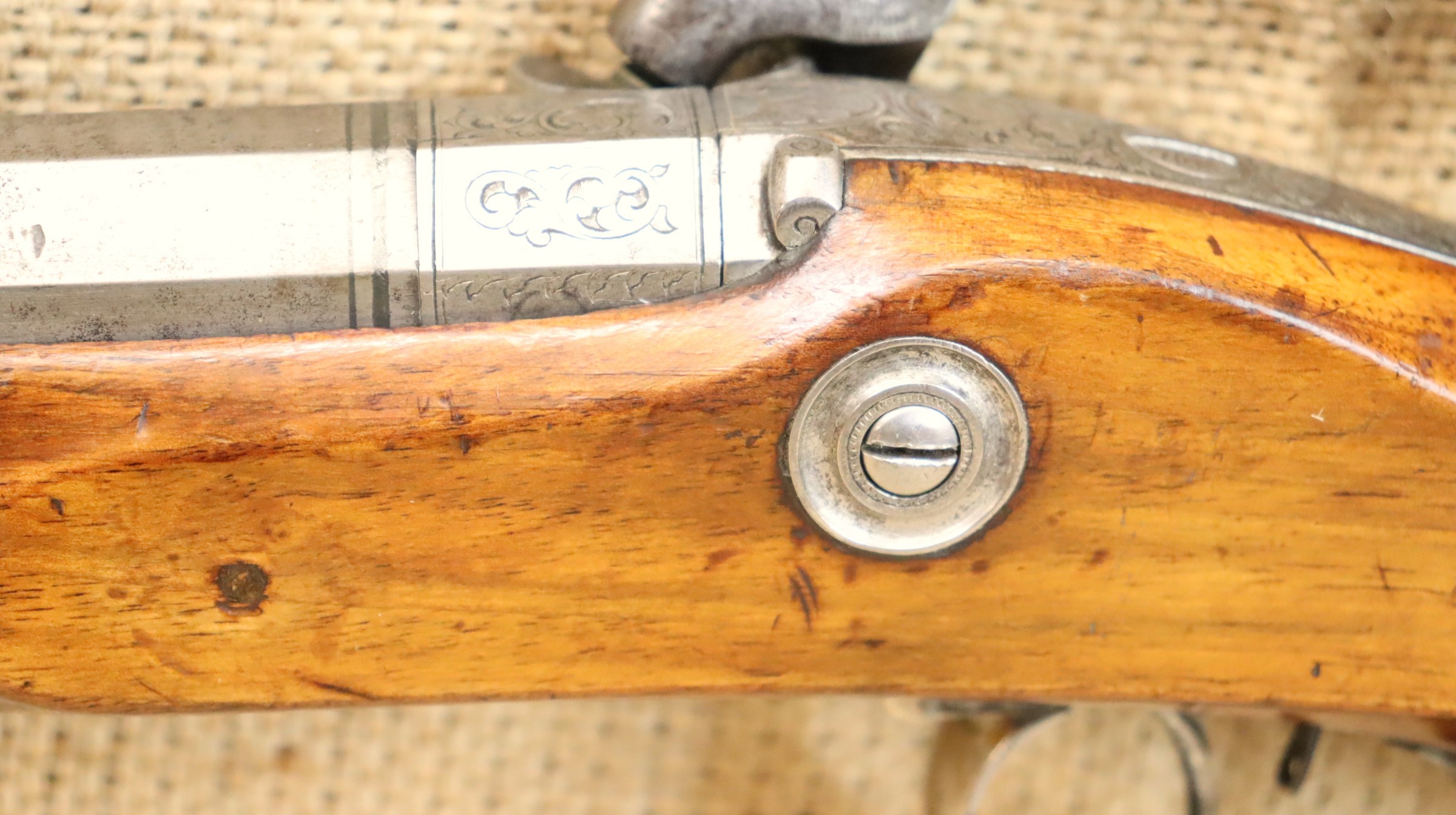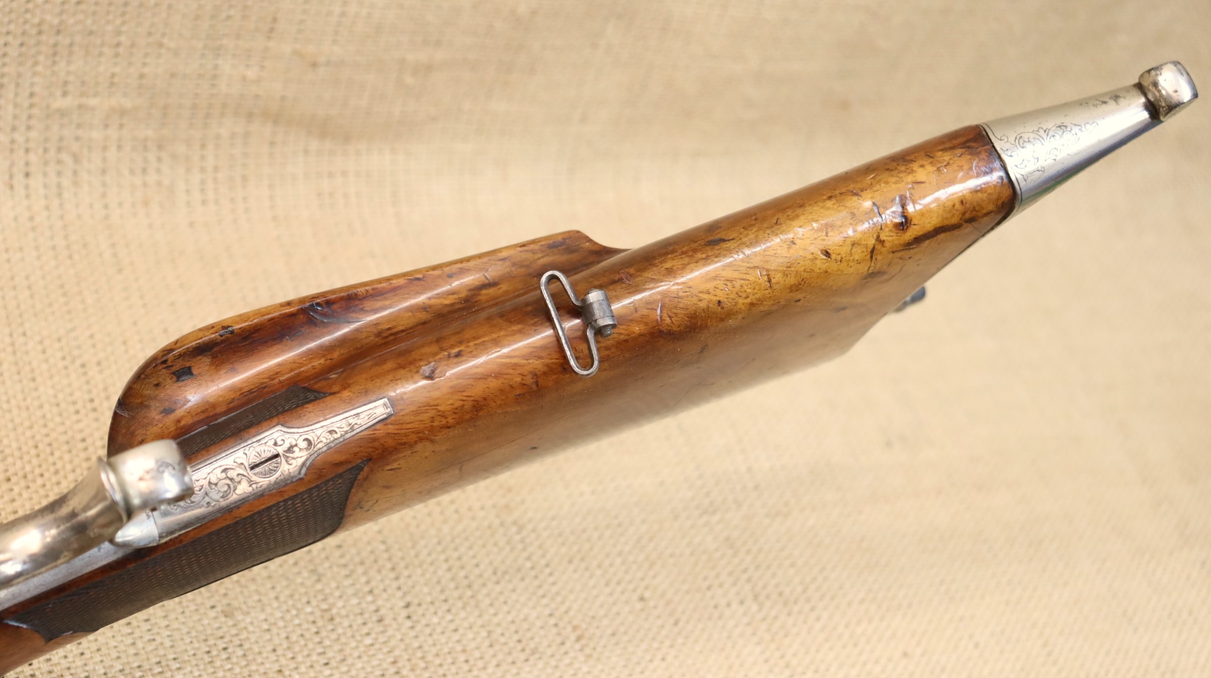 Schöne originale Scheibenbüchse in noch sehr gutem Zustand. Lauf blank mit sehr gutem Zug- / Feldprofil. Kaliber ca. 10,2 mm (an der Mündung gemessen).