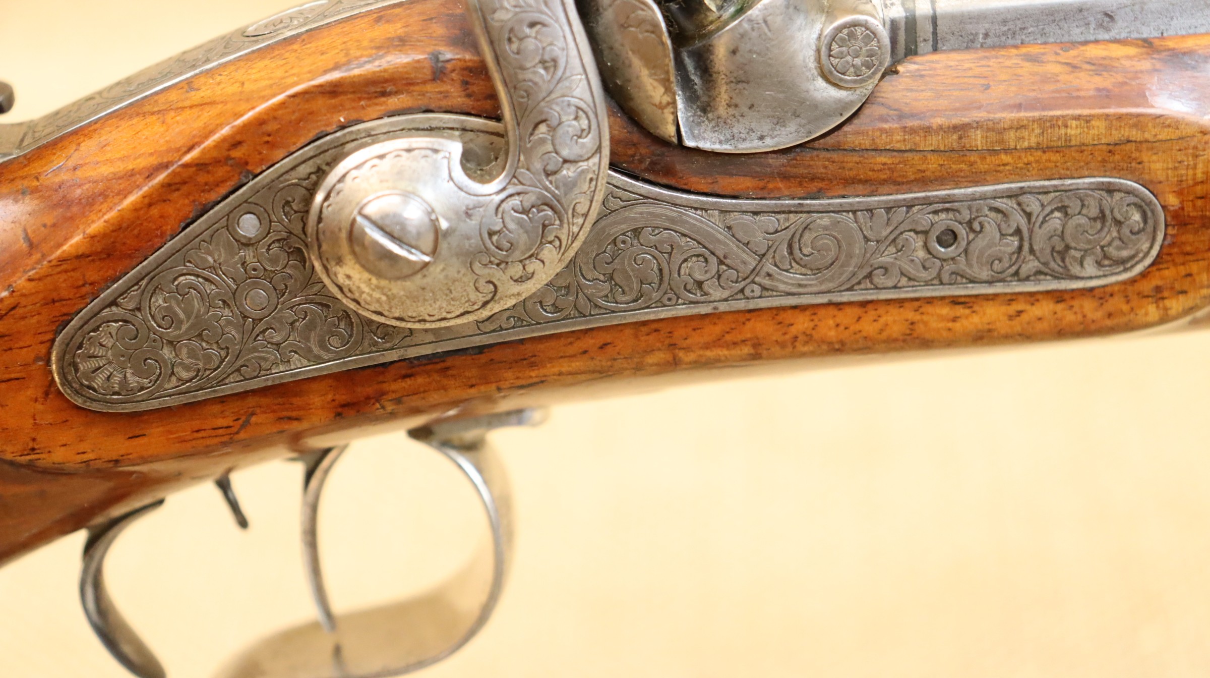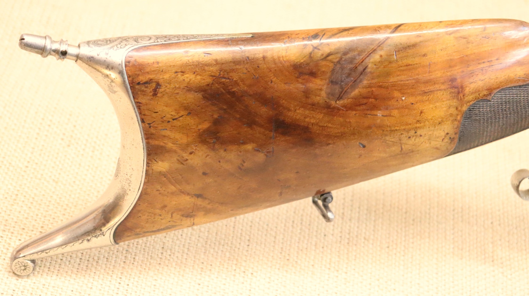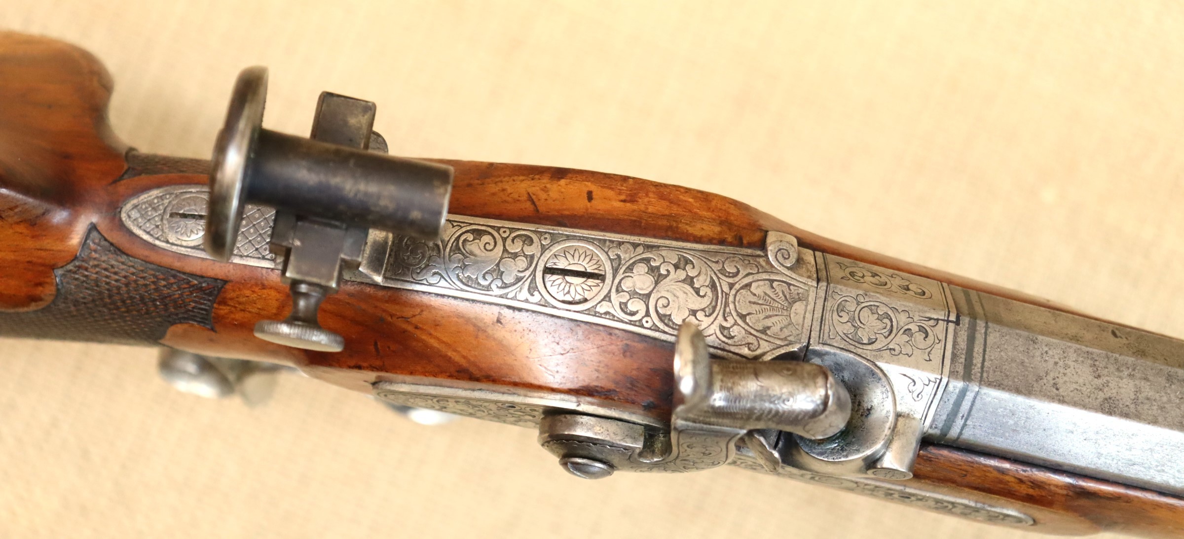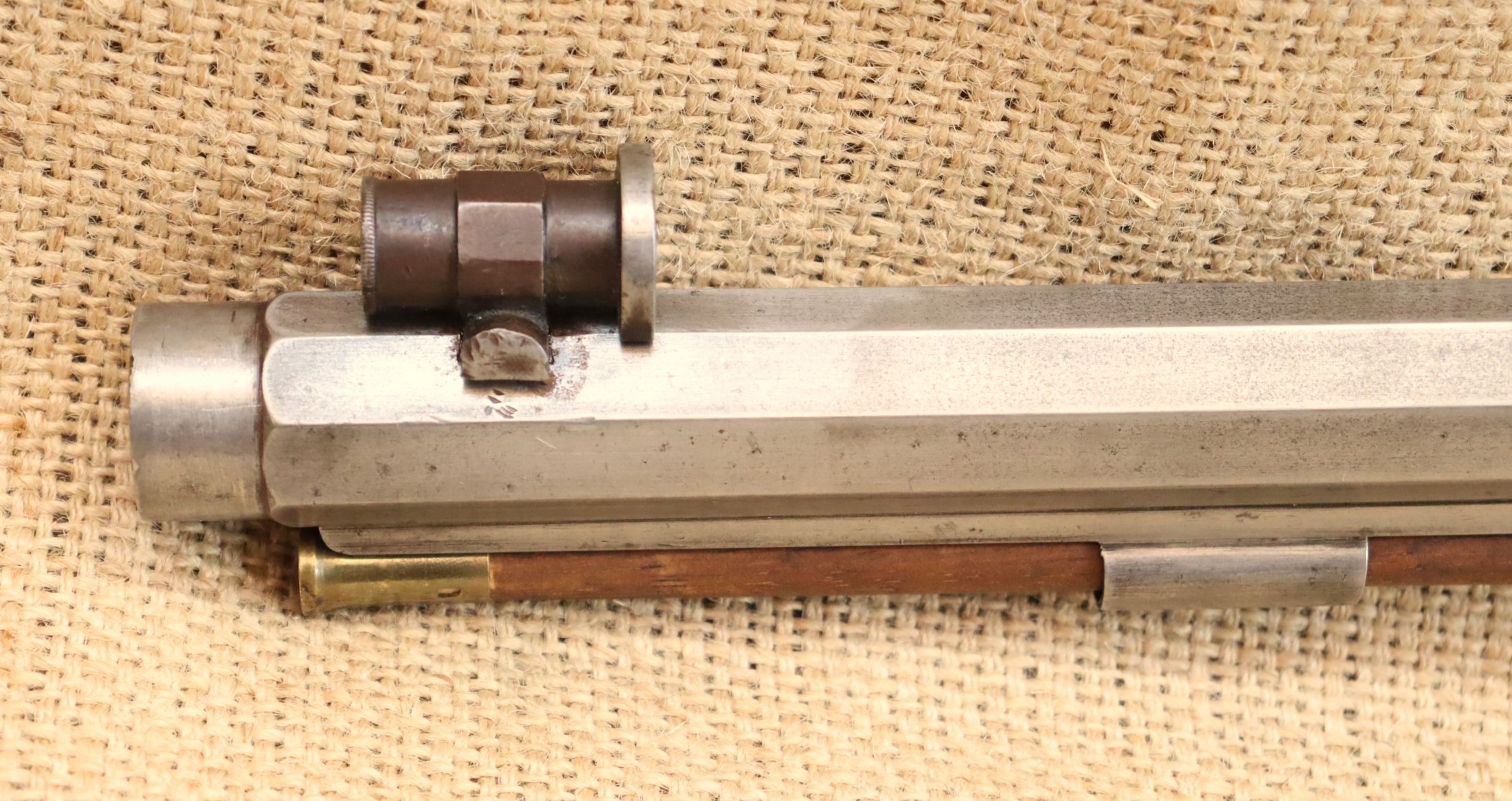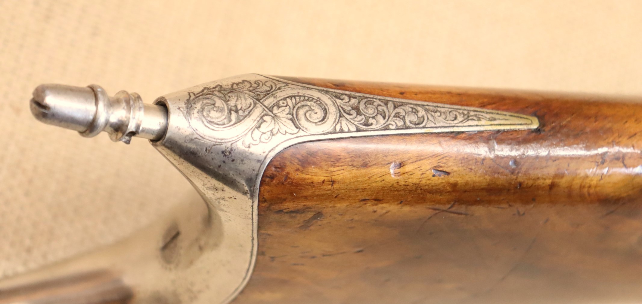 Schöne originale Scheibenbüchse in noch sehr gutem Zustand. Lauf blank mit sehr gutem Zug- / Feldprofil. Kaliber ca. 10,2 mm (an der Mündung gemessen).