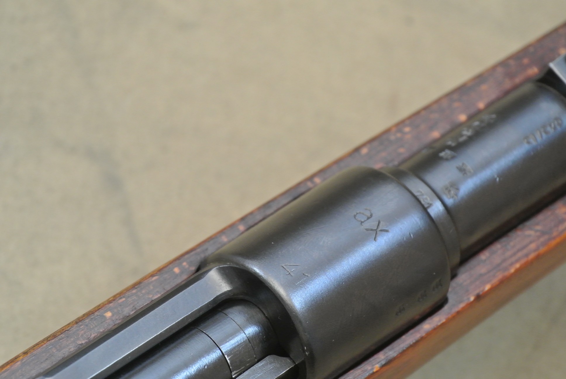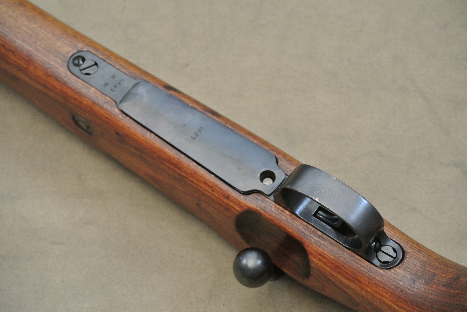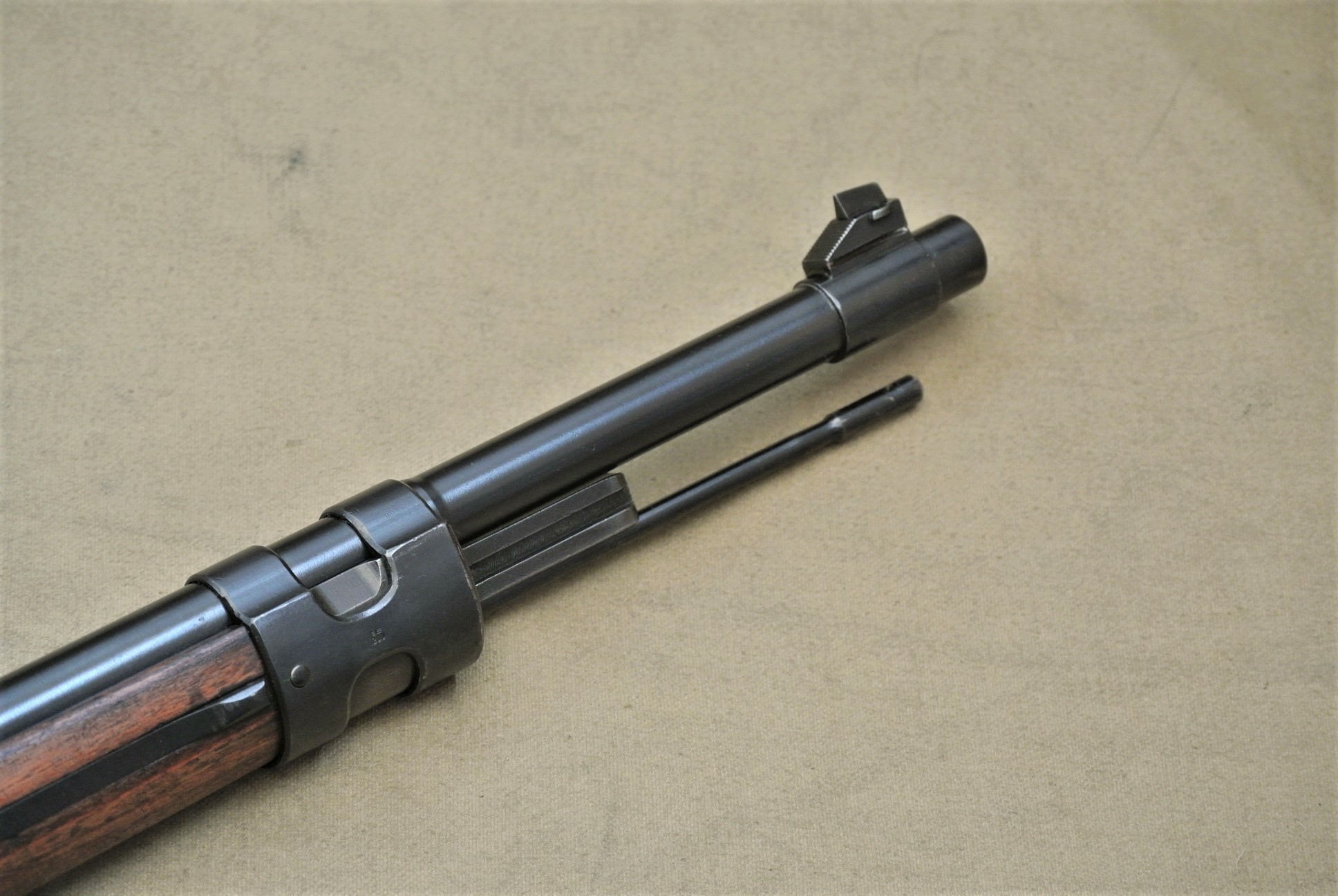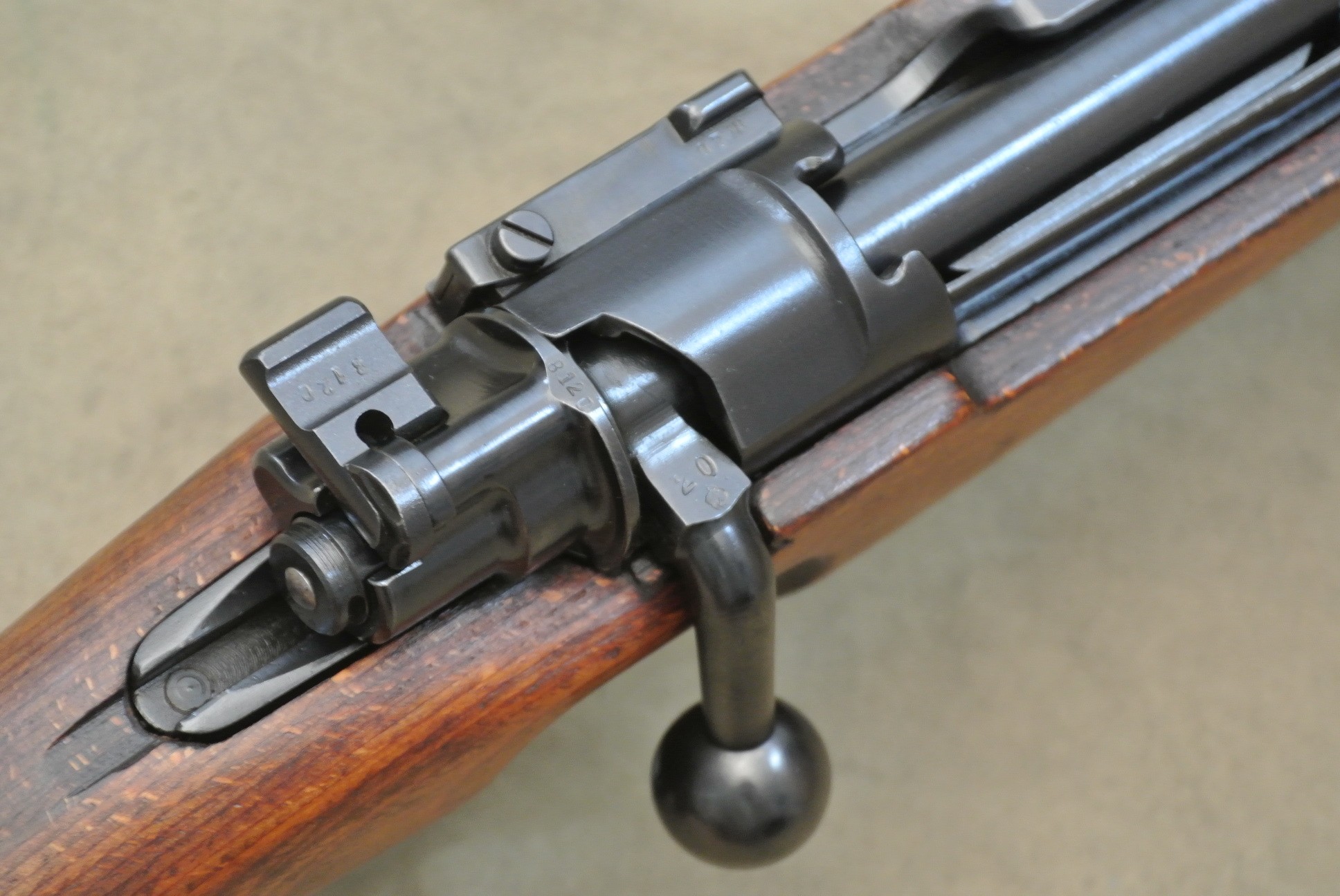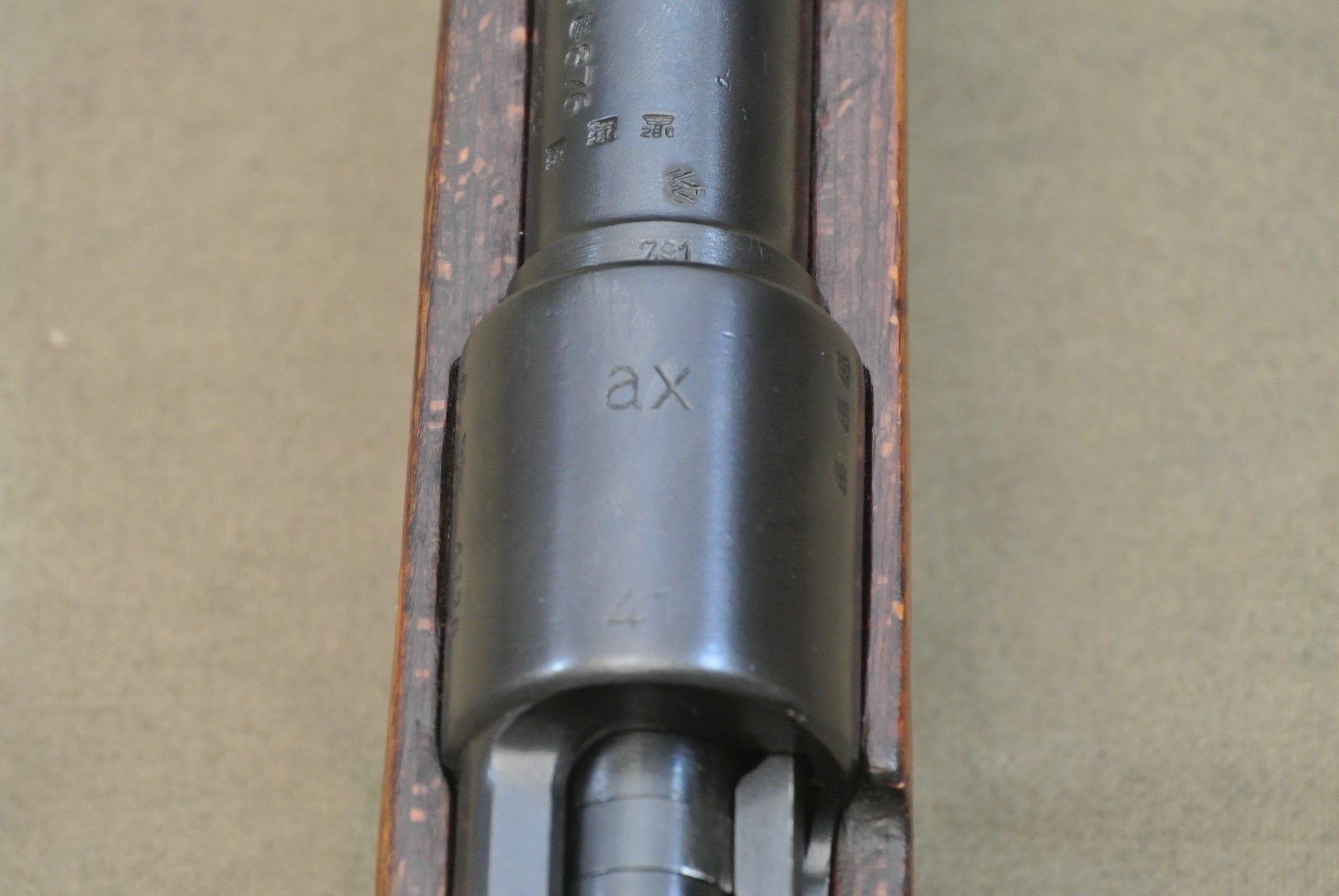 Sehr guter Zustand, spiegelblanker Lauf, nummerngleich bis auf das Schloss (8120), die Schlagbolzenmutter (8120) und den Patronenausziher (36).