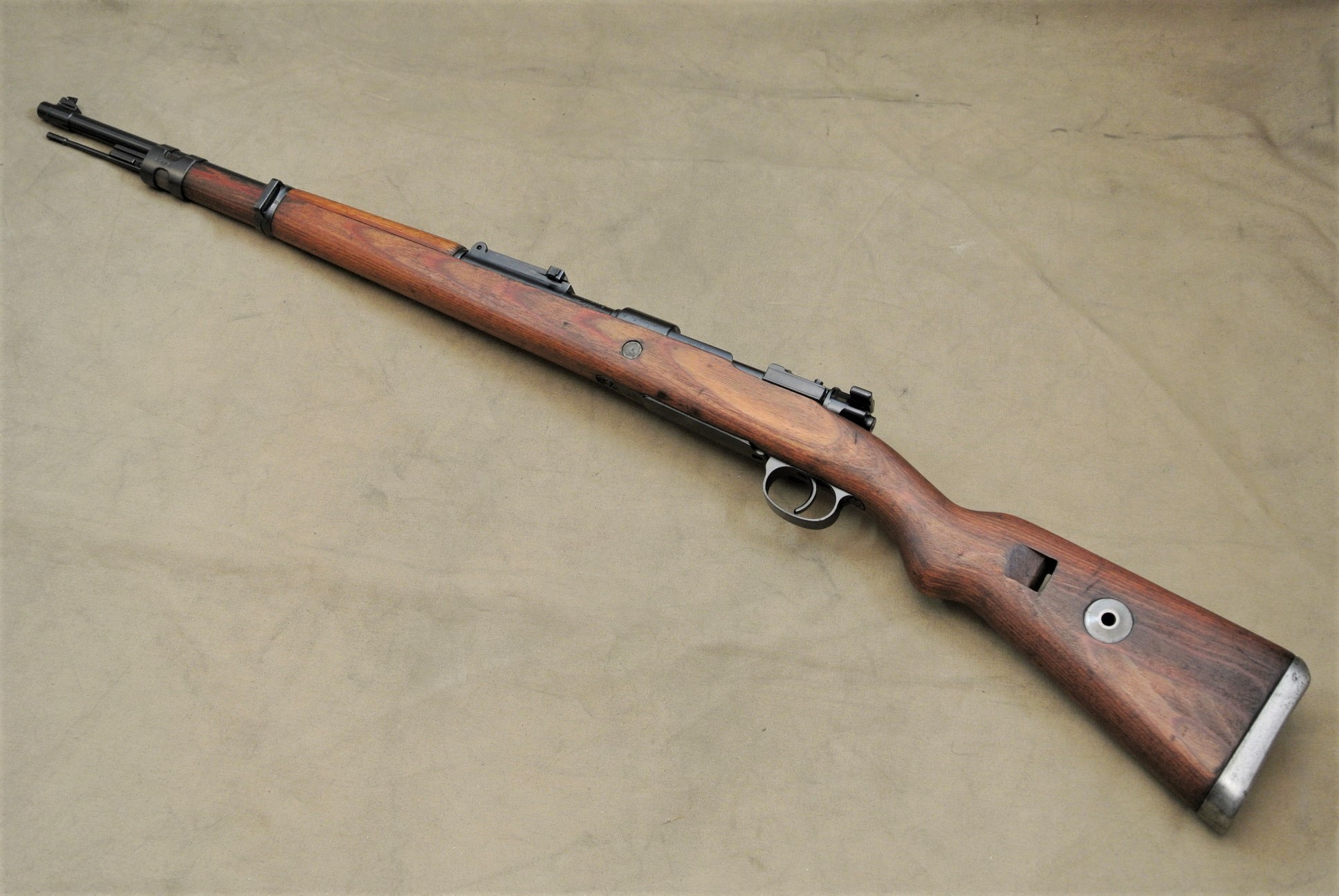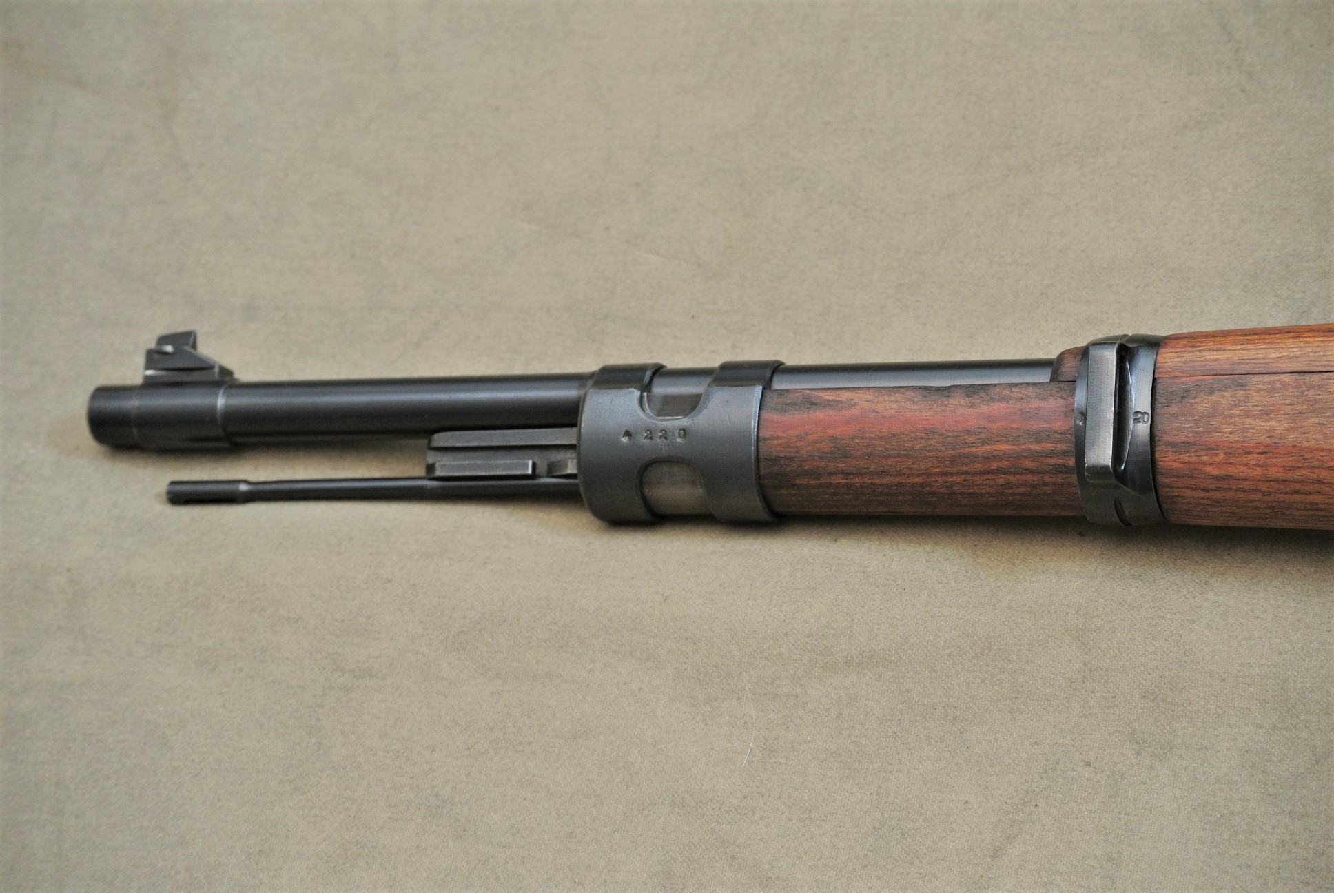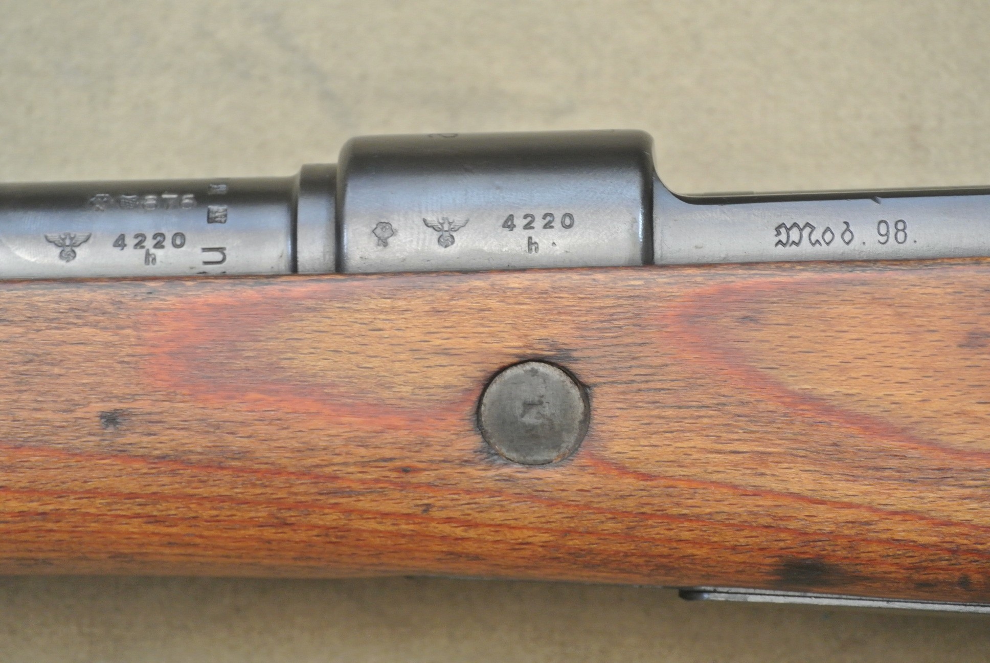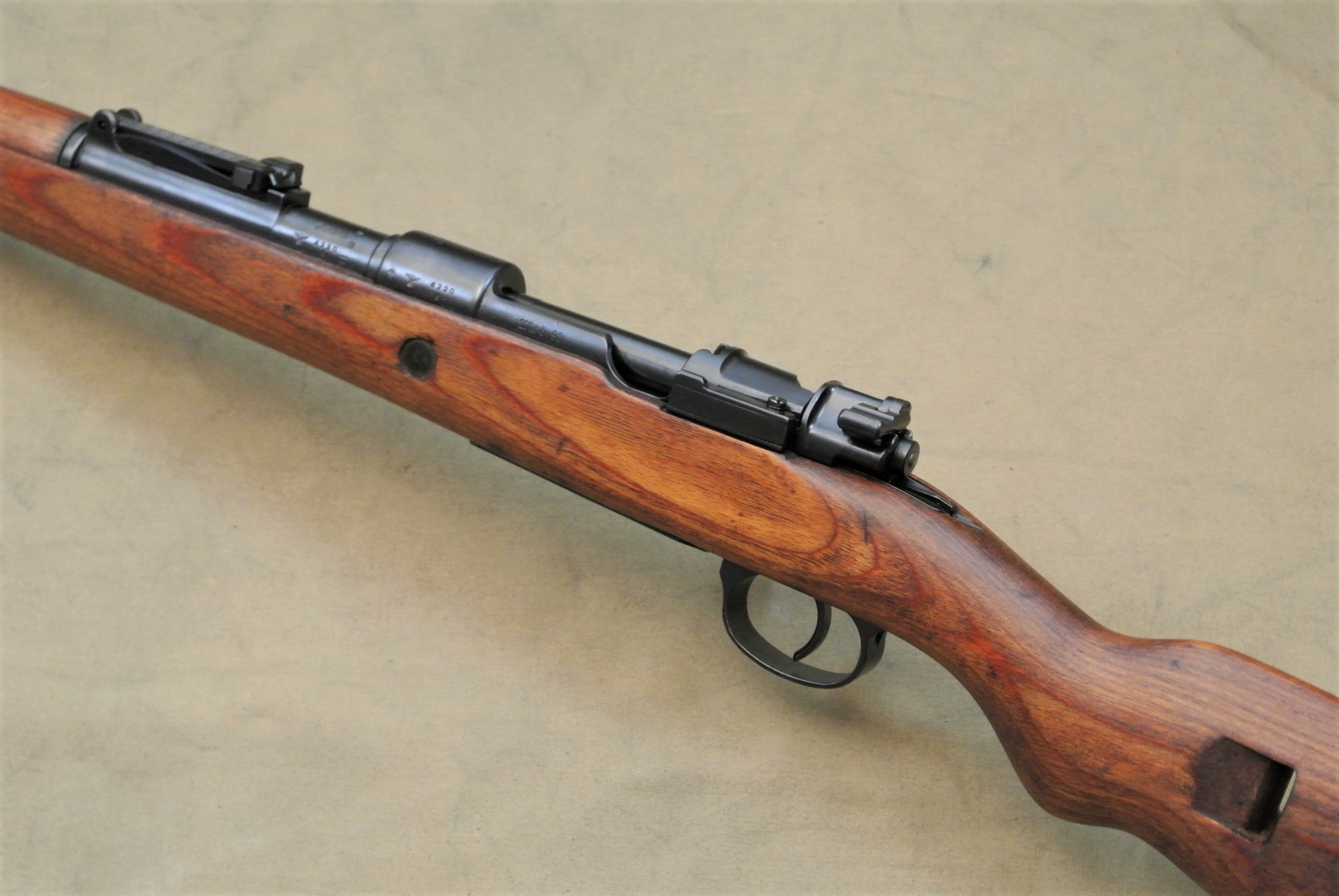 Sehr guter Zustand, spiegelblanker Lauf, nummerngleich bis auf das Schloss (8120), die Schlagbolzenmutter (8120) und den Patronenausziher (36).