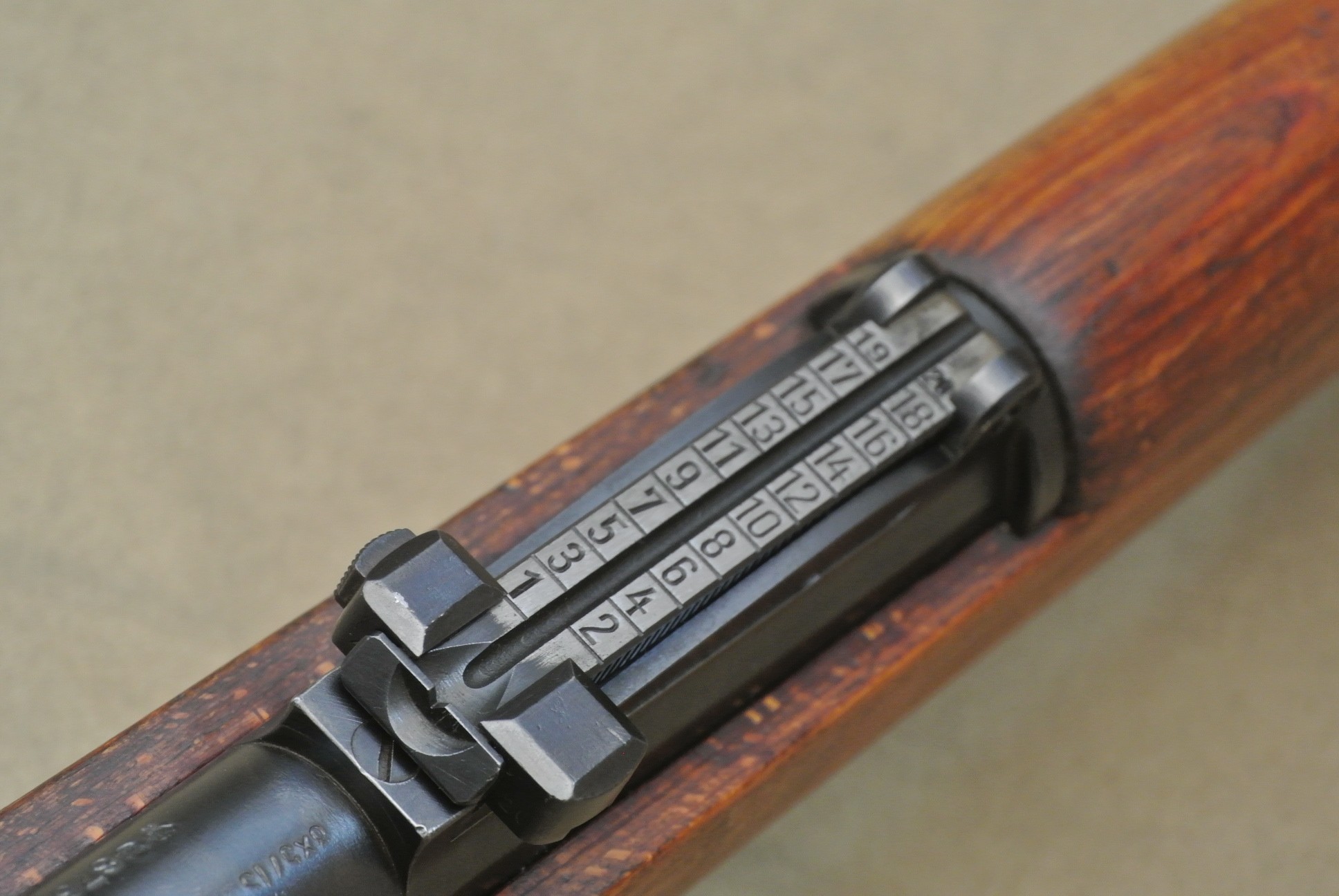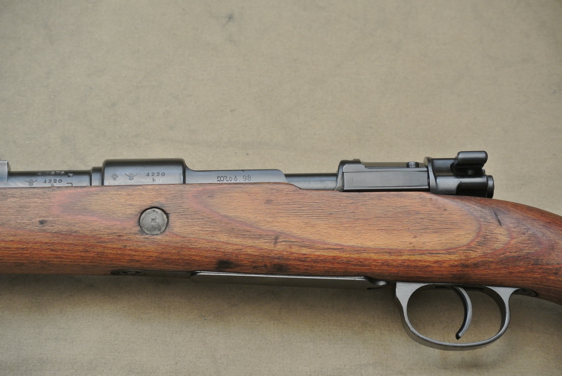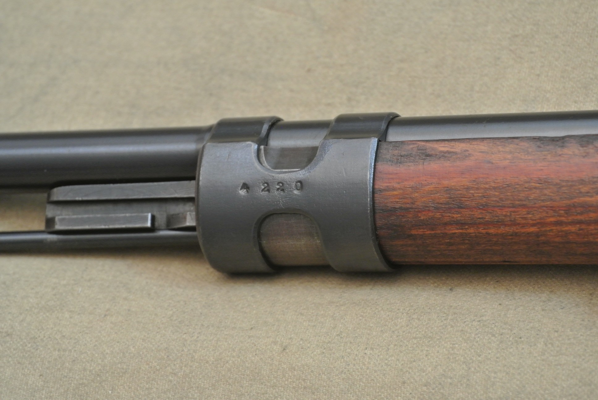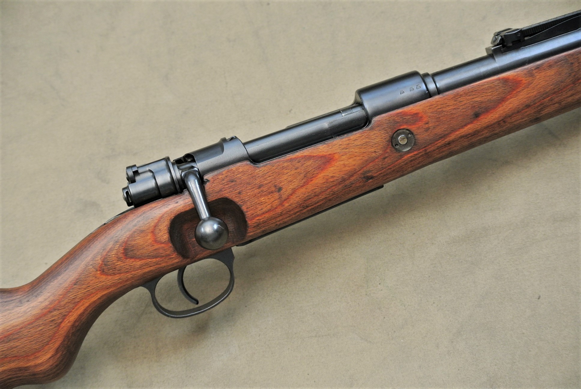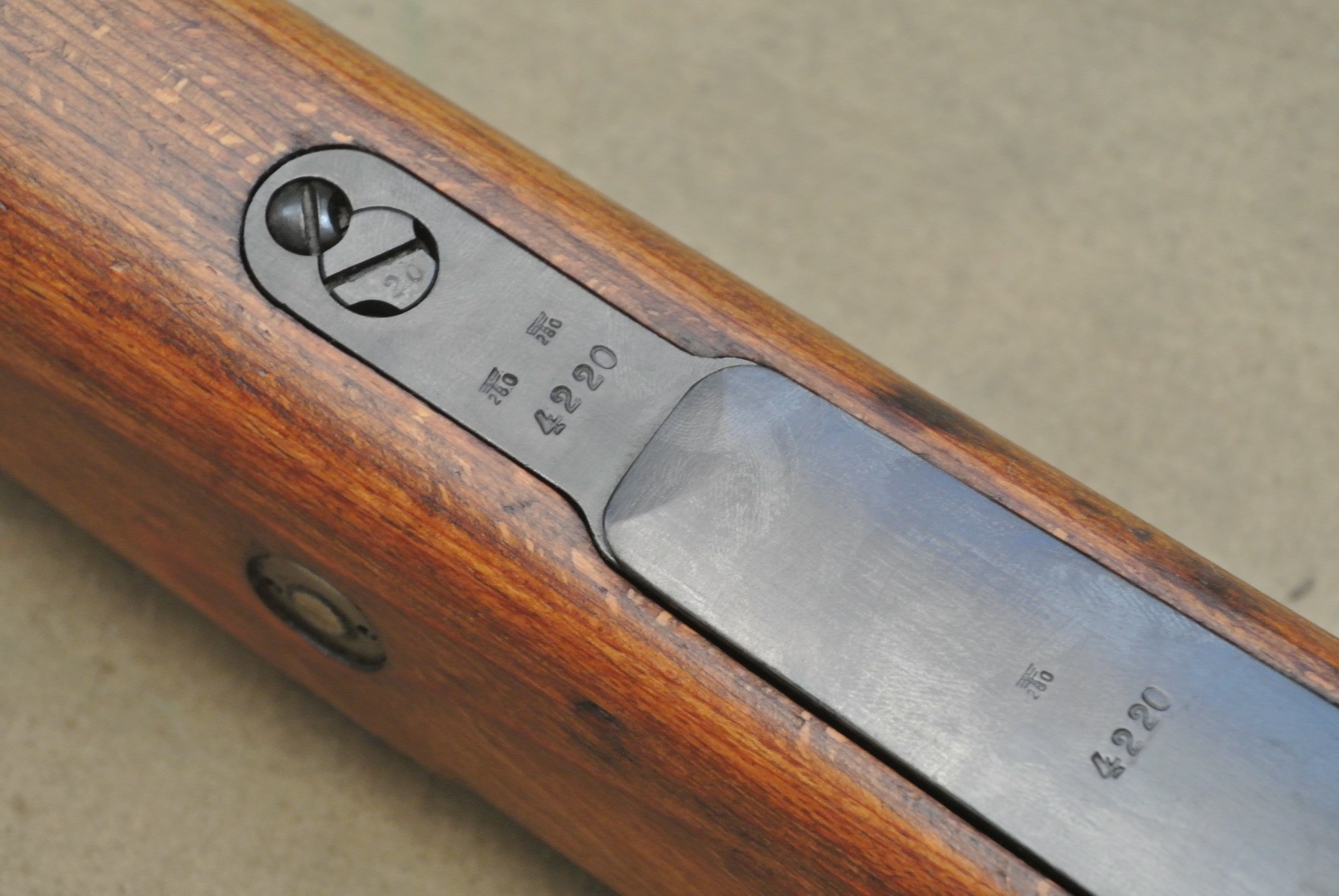 Sehr guter Zustand, spiegelblanker Lauf, nummerngleich bis auf das Schloss (8120), die Schlagbolzenmutter (8120) und den Patronenausziher (36).